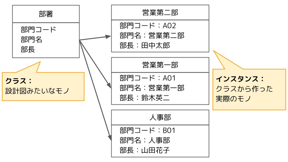 クラスは設計図、インスタンスはクラスから作った実際のモノです。