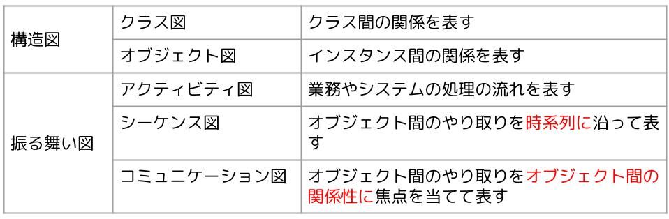 UMLにはシステムの構造を表す構造図と処理の流れやオブジェクト間の時系列に沿ったやり取り等を表す振る舞い図があります。