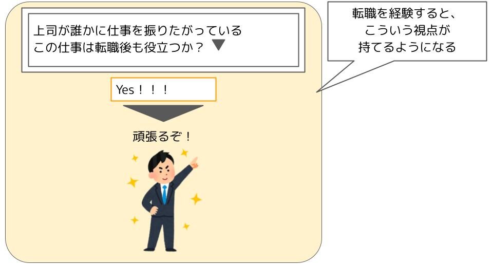 また、普段から「この仕事は転職市場で評価されるか?」という視点を持つことができます。この経験は次の転職でも武器になりそうだから力を入れようとか、この経験はこの会社でしか活かせないだろうから程ほどにやろうとか、自分の行動の基準が1つできたような感覚ですね。